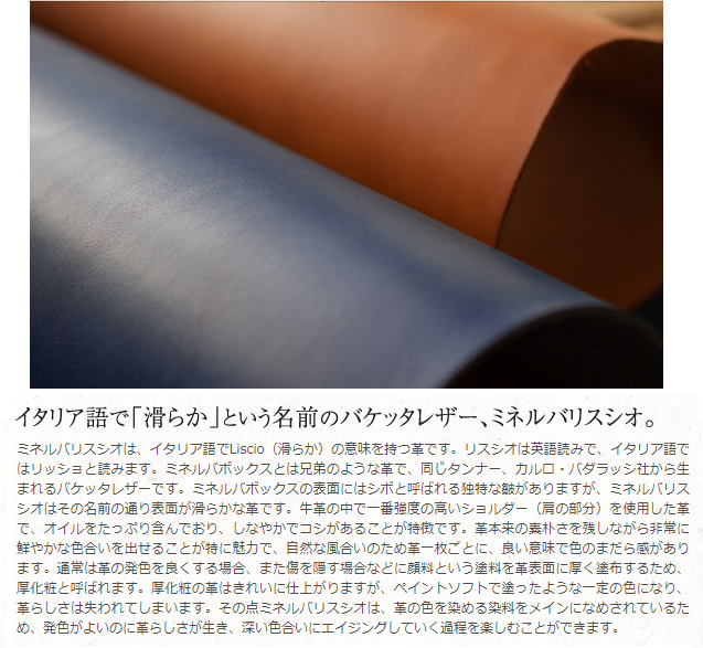 ミネルバリスシオは、イタリア語でLiscio(滑らか)の意味を持つレザーで、イタリアのタンナー『バダラッシ・カルロ社』で生産されています。