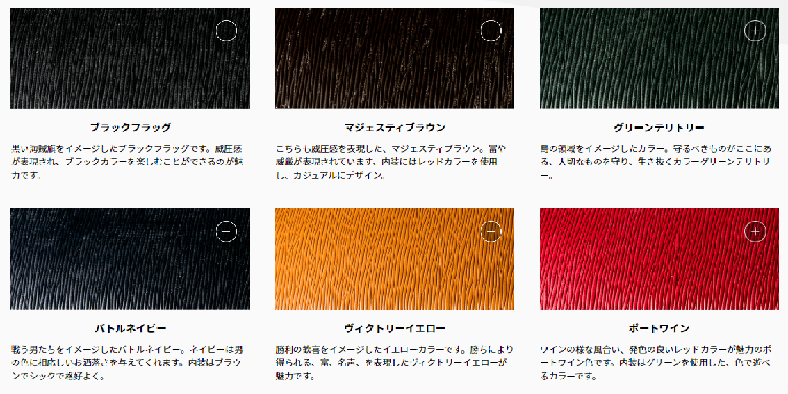 また海賊旗らしくヴィクトリーイエローやポートワインもそれぞれ遊び心があって、男らしい人でも持てるカラーとなっています。財布と同系色で合わせるのも良し、違うカラーで持つのも良し、今一番欲しい色を選びましょう。